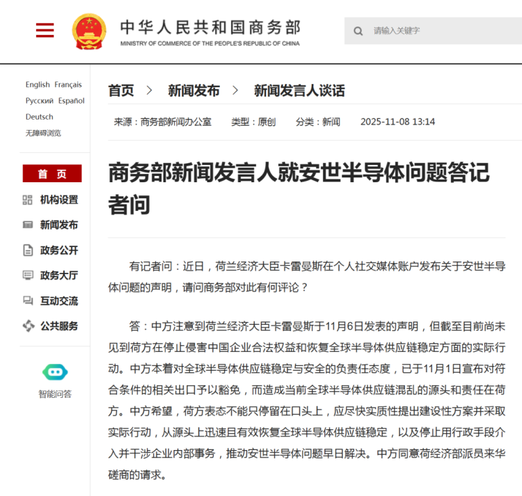11月8日,商务部回应安世半导体问题:中方同意荷方派员来华磋商的请求。