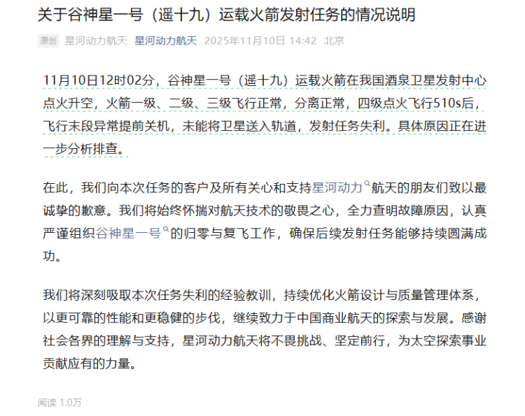 11月10日,谷神星一号(遥十九)运载火箭发射任务失利,星河动力航天发布情况声明:飞行末段异常提前关机,未能将卫星送入轨道,具体原因正在排查。