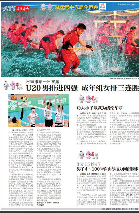11月10日, 开幕式后的第一个比赛日,河南排球“双喜临门”。U20男排在四分之一决赛中3∶0完胜上海队,挺进4强。而由朱婷领衔的河南女排在成年组比赛中继续高歌猛进,3∶0兵不血刃地拿下四川队,取得3连胜,基本锁定8强席位。在广州华南农业大学体育馆举行的男排U20四分之一决赛,河南队面对上海队同样打得顺风顺水,前两局他们25∶20、25∶18连下两城,只是在第三局开局之后遭遇了对手的顽强反攻,比分一度落后。但经过调整之后迅速将比分追至15平并实现反超,此后再没给对手太多机会,25∶21拿下第三局,3∶0取得完胜,闯进4强。