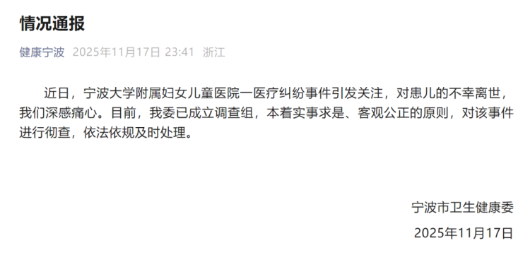 宁波卫健委11月17日深夜通报“5个月女婴心脏手术离世”:已成立调查组,对该事件彻查,依法依规及时处理。