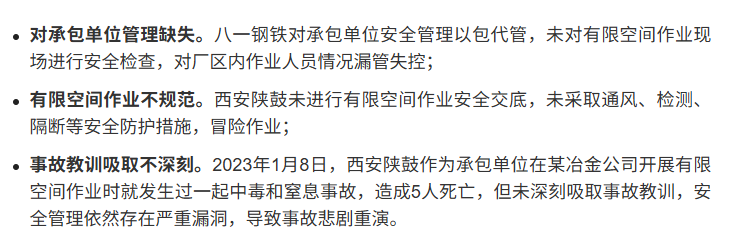 近日,国务院安委会办公室向各地区、各有关部门和中央企业通报了新疆八一钢铁股份有限公司“10·18”较大中毒窒息事故。事故发生在八一钢铁股份有限公司能源环保部制氧工序,承包单位西安陕鼓动力股份有限公司违规开展空气压缩机润滑油箱清理作业,造成4人死亡。通报指出,事故暴露出三方面突出问题: