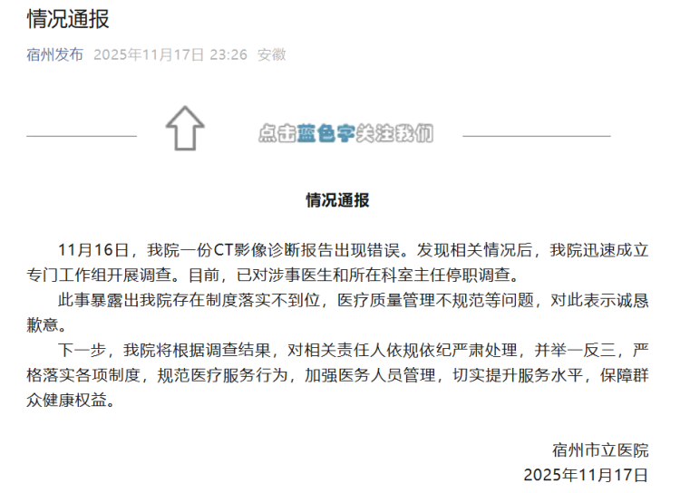 11月17日晚,安徽宿州市立医院就“一男子CT报告显示‘子宫未见异常’”一事发布情况通报:影像诊断报告出现错误,涉事医生和所在科室主任已停职调查。