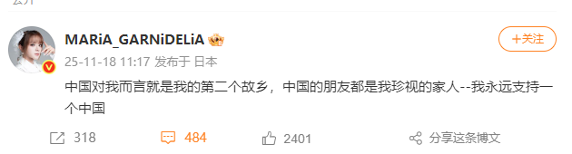11月18日,日本歌手美依礼芽发文:“中国对我而言就是我的第二个故乡,中国的朋友都是我珍视的家人——我永远支持一个中国。”