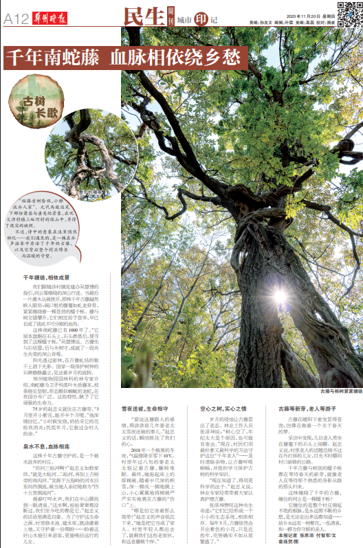 岁月的侵蚀让古藤显出了老态。林业工作人员张泽坤说:“树心空了,年纪太大是个原因,也可能有害虫。”现在,村民们用最朴素又最科学的方法守护这位“千年老人”——及时清除杂物,让古藤呼吸顺畅,并组织学习保护古树的科学知识。