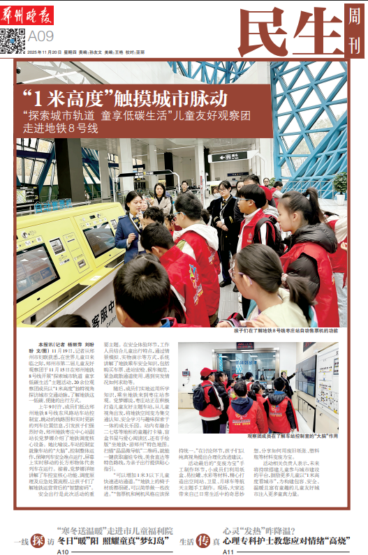 11月19日,记者从郑州市妇联获悉,在世界儿童日来临之际,郑州市第二届儿童友好观察团于11月15日在郑州地铁8号线开展“探索城市轨道 童享低碳生活”主题活动,20余位观察团成员以“1米高度”独特视角探访城市交通动脉,了解地铁这一低碳、便捷的出行方式。