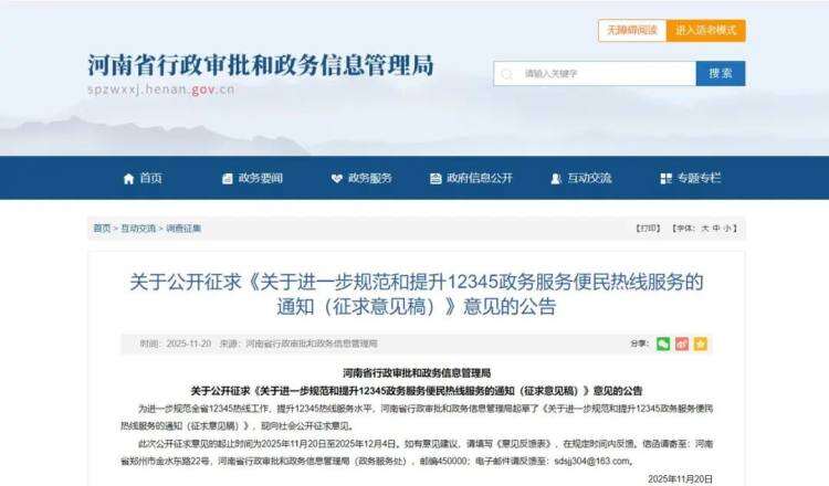 11月20日,省行政审批政务信息管理局起草了《关于进一步规范和提升12345政务服务便民热线服务的通知(征求意见稿)》(以下简称《征求意见稿》),面向社会公开征求意见。