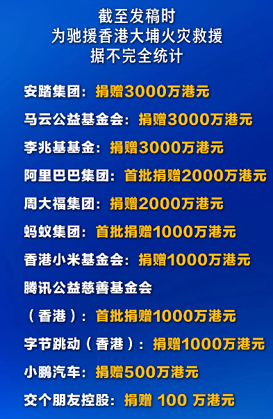 此外,11月27日下午,澳门霍英东基金会、香港霍英东基金会及霍英东集团宣布捐赠3000万港元支援大埔宏福苑居民。