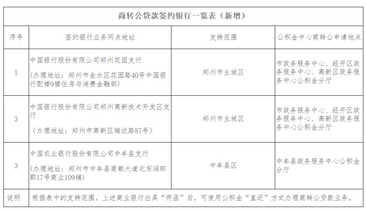 11月27日,郑州住房公积金管理中心发布通知,新增中国银行股份有限公司郑州花园支行、中国银行股份有限公司郑州高新技术开发区支行、中国农业银行股份有限公司中牟县支行共3家商业银行成为“商转公贷款”签约银行。截至目前,郑州已有63家银行支持商转公贷款直还模式。