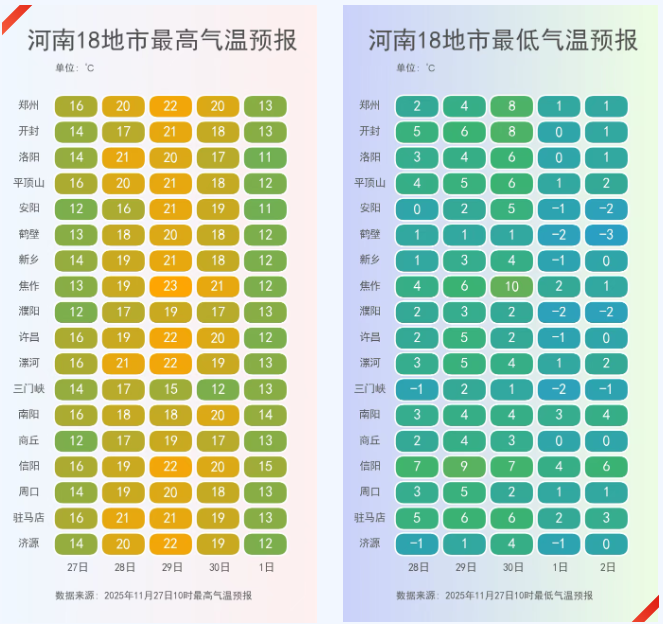 11月26日,河南出现大范围大风天气,中西部、西北部部分地区阵风达9~13级。今起三天全省以晴朗多风为主,大风强度减弱(3~4级、阵风6级左右),中东部部分地区伴有扬沙或浮尘,空气干燥、森林火险等级持续较高。气温逐步回升,29日多地最高气温达20℃+,但30日起气温将下滑,12月1日最高气温降至11℃~15℃,中西部、北部降幅明显。