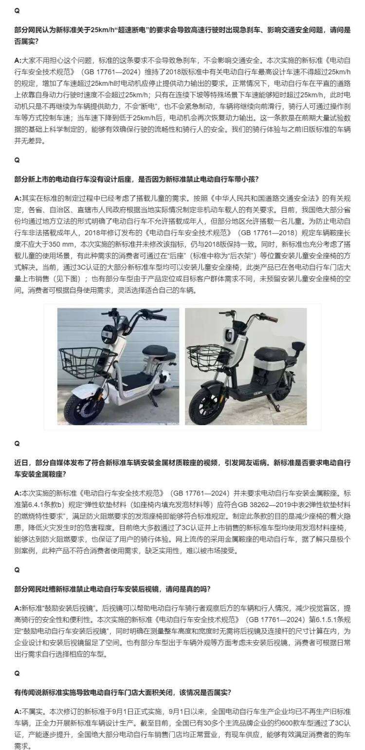 12月1日,新修订的强制性国家标准《电动自行车安全技术规范》(GB 17761—2024)实施过渡期正式结束,符合新标准的电动自行车陆续投放市场。近日,部分网民对标准的相关内容提出了疑问。为主动回应公众关切,中国电子技术标准化研究院作为该标准的主要起草单位,就有关问题解答如下↓↓↓