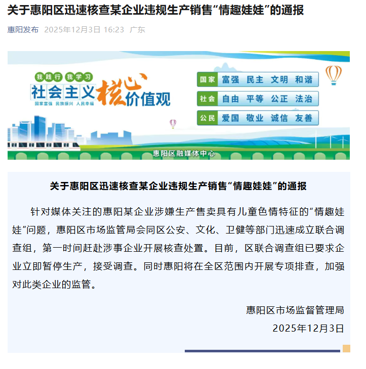 12月3日,广东惠州惠阳区通报“某企业涉嫌生产售卖具有儿童色情特征的‘情趣娃娃’”:暂停生产,接受调查,将在全区范围内开展专项排查,加强监管。