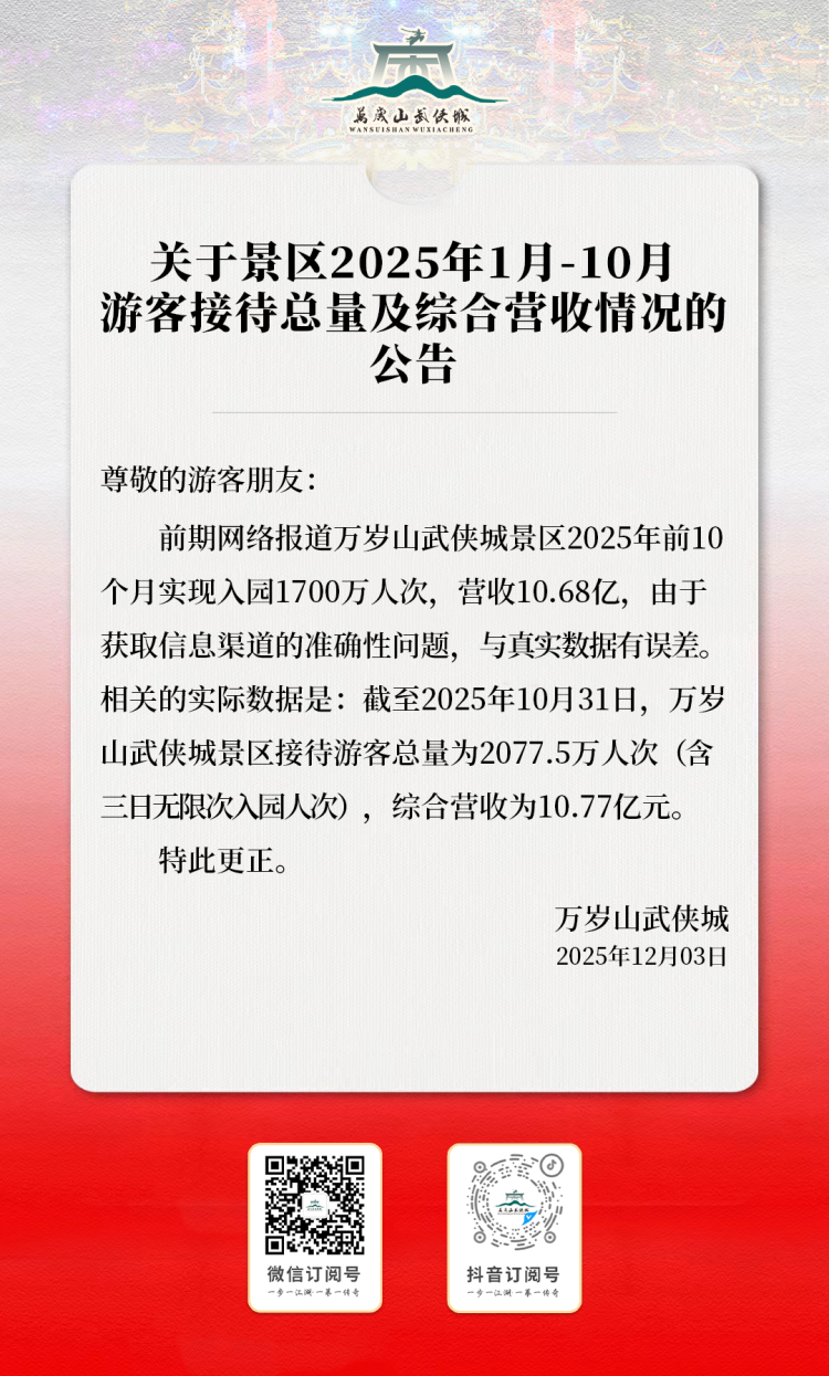 12月3日,开封万岁山武侠城发布公告,更正2025年前10个月游客接待量与营收数据,实际接待2077.5万人次(含三日无限次入园人次)、营收10.77亿元,较网传数据多近400万人次。景区因“王婆说媒”走红后,有游客反映“打铁花”项目难预约,疑似有“黄牛”倒卖名额。景区致歉并承诺将立即彻查该现象,绝不姑息。