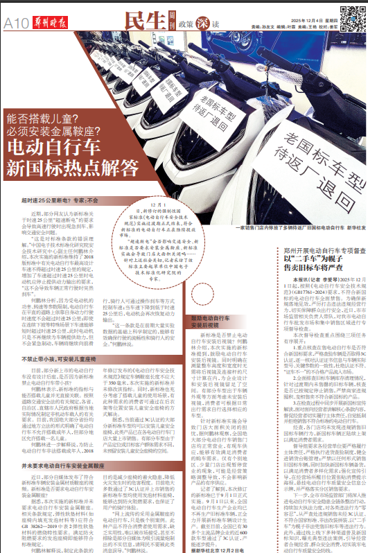 何鹏林进一步解释说,为防止电动自行车非法搭载成年人,2018年修订发布的《电动自行车安全技术规范》规定车辆鞍座长度不应大于350毫米,本次实施的新标准并未修改该指标。同时,新标准也充分考虑了搭载儿童的使用场景,有此种需求的消费者可通过在后衣架等位置安装儿童安全座椅的方式解决。