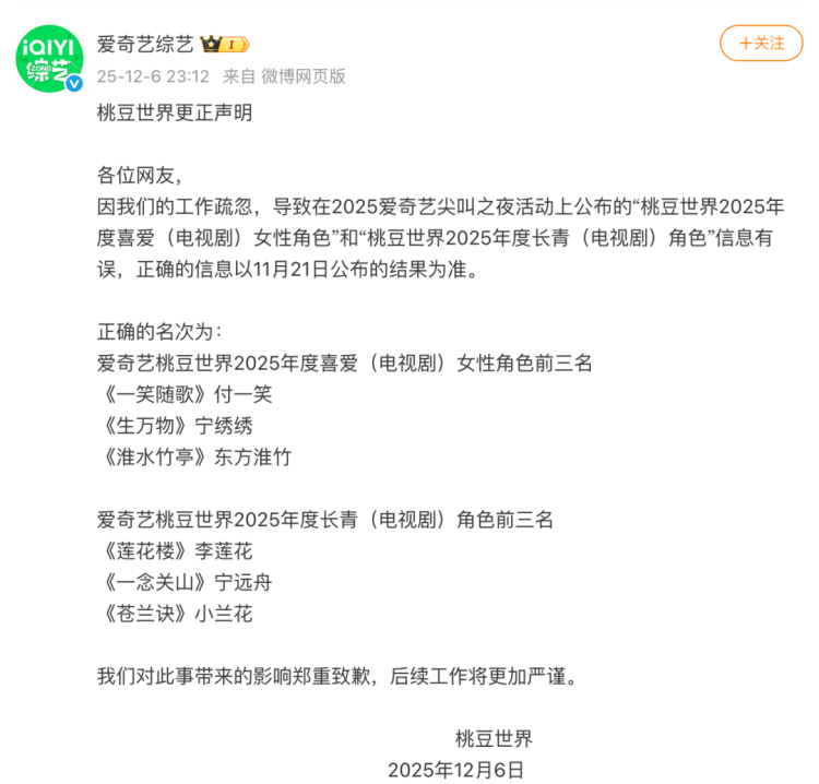 12月6日晚,澳门爱奇艺尖叫之夜颁奖礼出现奖项公示结果与现场播报不一致的乌龙事件,刘诗诗的奖被换成白鹿,爱奇艺深夜道歉:因工作疏忽信息有误,以此前公布结果为准。