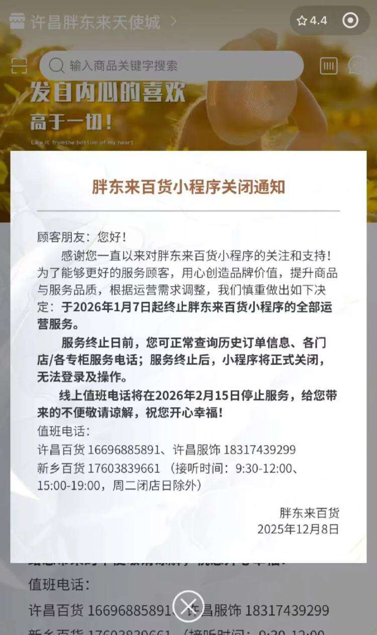 12月8日,胖东来百货小程序发布通知,2026年1月7日起终止全部运营服务。记者查询该小程序发现,其商品页面已全部清空,而在品牌页面,则只显示线下商场品牌信息与联系方式,不再提供购买途径。