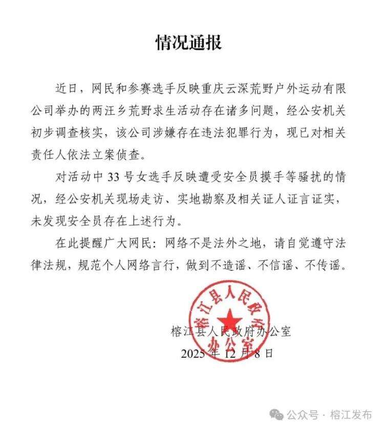 12月8日深夜,贵州榕江再通报:“荒野求生”主办方涉嫌存在违法犯罪行为,相关负责人被立案侦查;未发现安全员存在骚扰33号女选手行为。