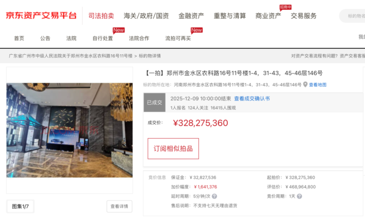 12月9日,记者从京东资产交易平台上看到,郑州五星级酒店富力万达文华酒店于当日拍卖落槌,最终以约3.28亿元成交。拍卖成交确认书显示,河南郑风郑韵酒店管理有限公司拍得该资产。