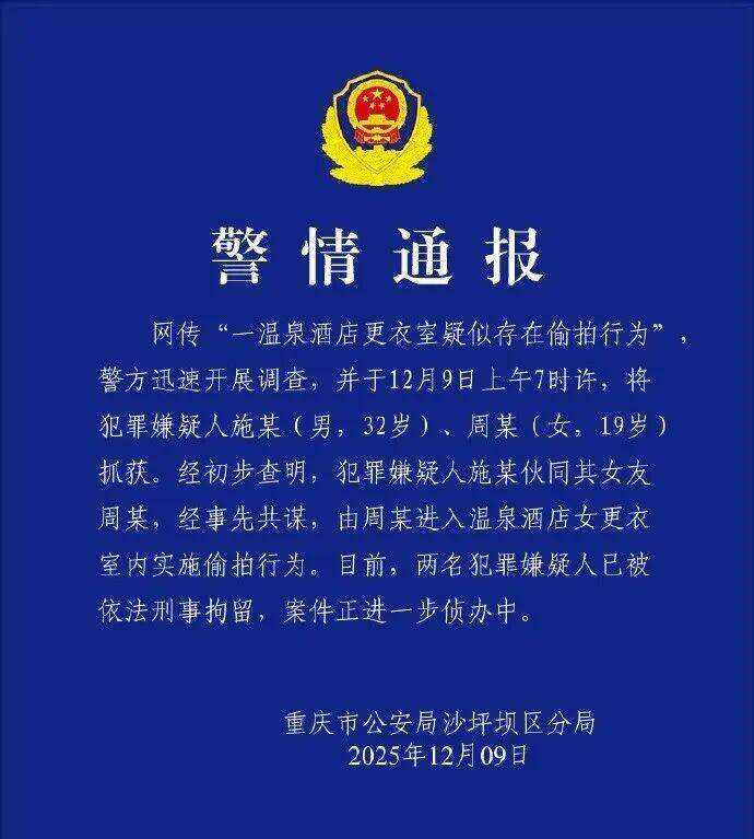 12月9日,重庆警方通报“一温泉酒店更衣室疑存在偷拍行为”:施某(男,32岁)伙同其女友周某(女,19岁),经事先共谋,由周某进入温泉酒店女更衣室内实施偷拍行为,目前两人已被刑拘。