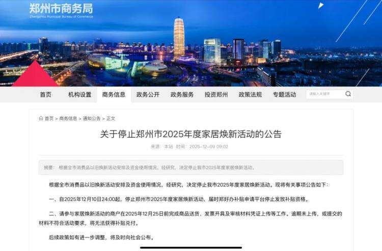 12月9日,郑州市商务局发布公告,决定停止2025年度家居焕新活动。《公告》明确,自2025年12月10日24:00起,停止郑州市2025年度家居焕新活动。届时,郑好办补贴申请平台停止发放补贴资格。