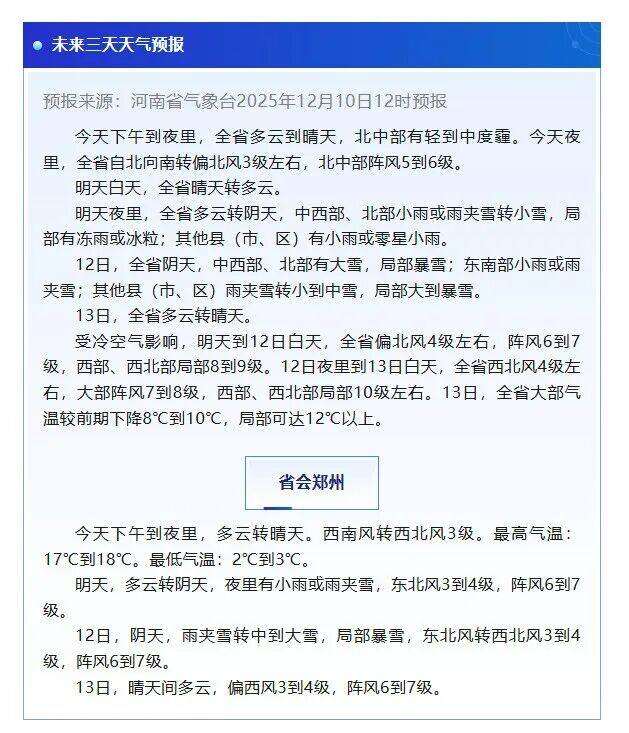 据河南气象,河南今冬以来最强雨雪即将上线,此次过程水汽充足且冷空气条件适宜。11日夜里起,中西部、北部先迎小雨或雨夹雪转小雪(局部有冻雨或冰粒);12日为主要雨雪时段,中西部、北部有大雪局部暴雪,其他地区雨夹雪转小到中雪,东部南部或为雨夹雪。过程中伴有大风,13日气温较前期下降8℃~10℃局部超12℃,雨雪后多地将出现道路结冰,需做好防范。具体天气↓