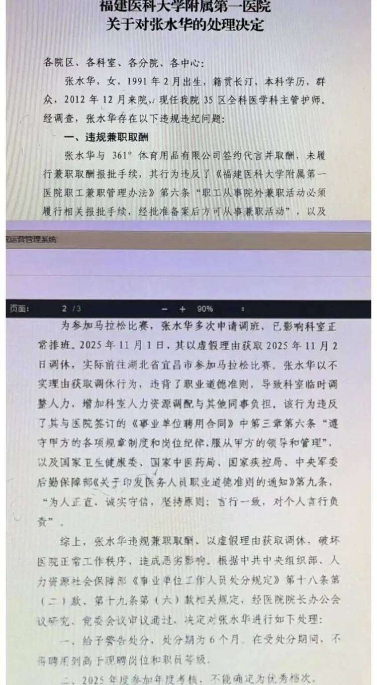 内部通报流出!“最快女护士”张水华被医院警告处分6个月,不能参与2025年评优:违规兼职取酬,以虚假理由调休参赛增加同事负担。对此,福建医科大学附属第一医院12月10日发布情况说明:依规依纪处理,重申不影响本职工作前提下,鼓励员工发展个人兴趣爱好。据悉,该处分文件为内部文件,未计划对外公布。医院已介入调查该处分文件为何泄露。张水华50天已跑4场比赛,奖金超20万元。