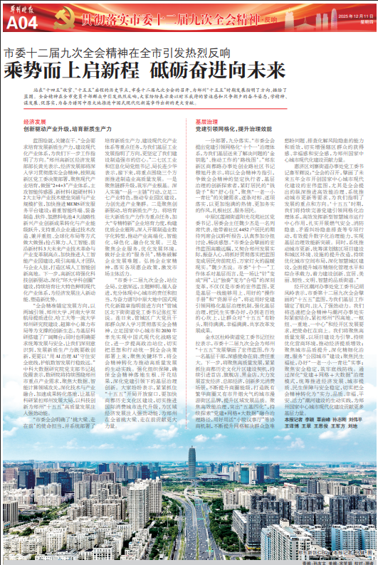 站在“十四五”收官、“十五五”启程的历史节点,市委十二届九次全会的召开,为郑州“十五五”时期发展指明了方向、描绘了蓝图。全会精神在全市党员干部群众中引发热烈反响,大家纷纷表示要以时不我待的紧迫感和只争朝夕的奋斗姿态,学精神、谋发展、促落实,为奋力谱写中原大地推进中国式现代化新篇章作出新的更大贡献。