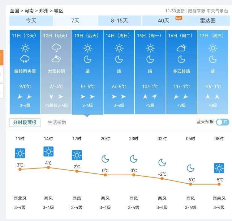 12月11日上午的郑州,艳阳高照,上午11时30分,中央气象台的数据显示郑州城区11日晴转雨夹雪,12日大雪转阴,这“暴雪”还下不?