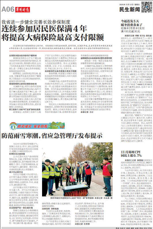 全省居民医疗保险缴费进入倒计时。为鼓励城乡居民按时缴费、连续参保,自2025年起,我省对连续参加居民医保满4年的参保人员,之后每连续参保一年,将适当提高大病保险最高支付限额。这是记者昨日从省医疗保障局获得的信息。