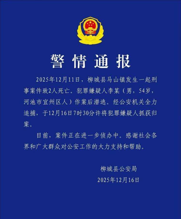 12月16日,广西柳州柳城警方通报:柳城县发生一刑事案件致2人死亡,犯罪嫌疑人李某(男,54岁)已抓获归案,此前其被悬赏10万元。