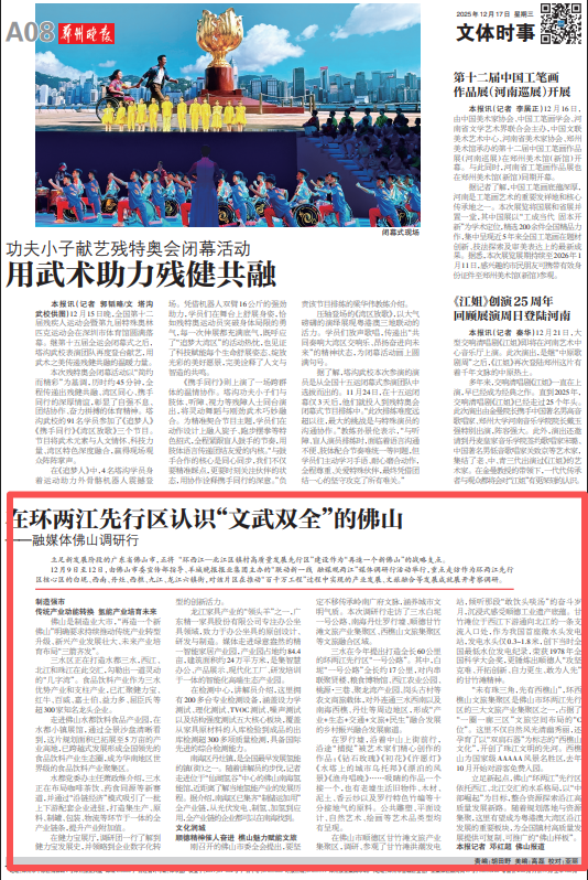 12月9日至12日,由佛山市委宣传部指导、羊城晚报报业集团主办的“联动新一线 融媒观两江”媒体调研行活动举行,重点走访作为环两江先行区核心区的白坭、西南、丹灶、西樵、九江、龙江六镇街,对该片区在推动“百千万工程”过程中实现的产业发展、文旅融合等发展成就展开考察调研。