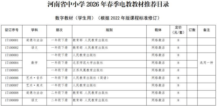 近日,河南省教育厅发布河南省中小学2026年春季电教教材推荐目录,含数字教材、教参及资源,2022年版课标相关资源同步更新。要求免费配发师生,做好技术保障与应用指导,由新华书店统一征订,确保经费专款专用、与纸质教材同步到校。