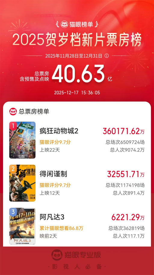 截至12月17日,2025年贺岁档新片总票房(含预售)已突破40亿元,较去年同期大幅增长超20亿元,市场热度显著攀升。迪士尼现象级动画《疯狂动物城2》以超过36亿元的票房成绩持续领跑;正午阳光首部院线电影《得闲谨制》票房突破3亿元,暂列档期票房榜第二位。