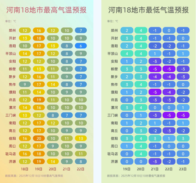 明天,河南大部地区最高气温将升至16℃~18℃,信阳地区或将达到20℃。同时,新一轮冷空气携大风、弱雨雪、降温影响河南。明天到20日白天,全省偏北风或西北风3~4级,中西部阵风6~7级。20日开始,全省霾自北向南逐渐减弱。弱雨雪主要时段在20日,西部、南部地区有小雨或零星小雨,其中高海拔山区有雨夹雪或小雪。受降水和冷空气的共同影响,预计20日~21日,河南气温明显下降。如郑州明天最高气温16℃,下周一逐渐降至7℃,累积降温幅度可达9℃;信阳则会从明天的20℃骤降至周六的10℃,一天的降温幅度达10℃。今后五天,我省多地气温波动大,不少地方冷暖转换明显。