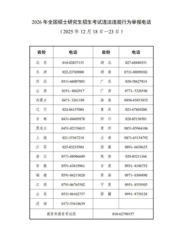 2026年全国硕士研究生招生初试时间为2025年12月20日至21日。12月18日,教育部公布2026年全国硕士研究生招生考试违法违规行为举报电话,邀请考生和公众参与监督。