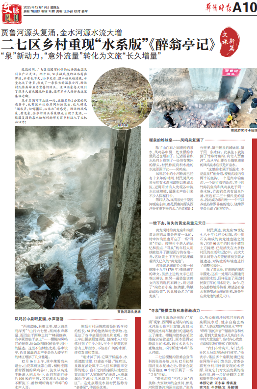 二七区樱桃沟管委会宣传科的张浩介绍,自从12月初梨园河泉水复涌之后,管委会就号召辖区10个村开展了一场“寻泉”行动。