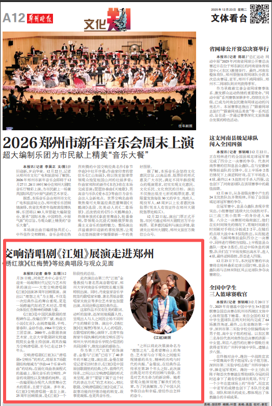 12月21日晚,河南艺术中心音乐厅迎来一场凝聚时代记忆与艺术传承的演出——大型交响清唱剧《江姐》创演25周年回顾展演。演出以“理想之光”为主题,不仅是一次经典作品的舞台重现,更是一场跨越代际的艺术对话,带观众体验红色精神的磅礴力量。
