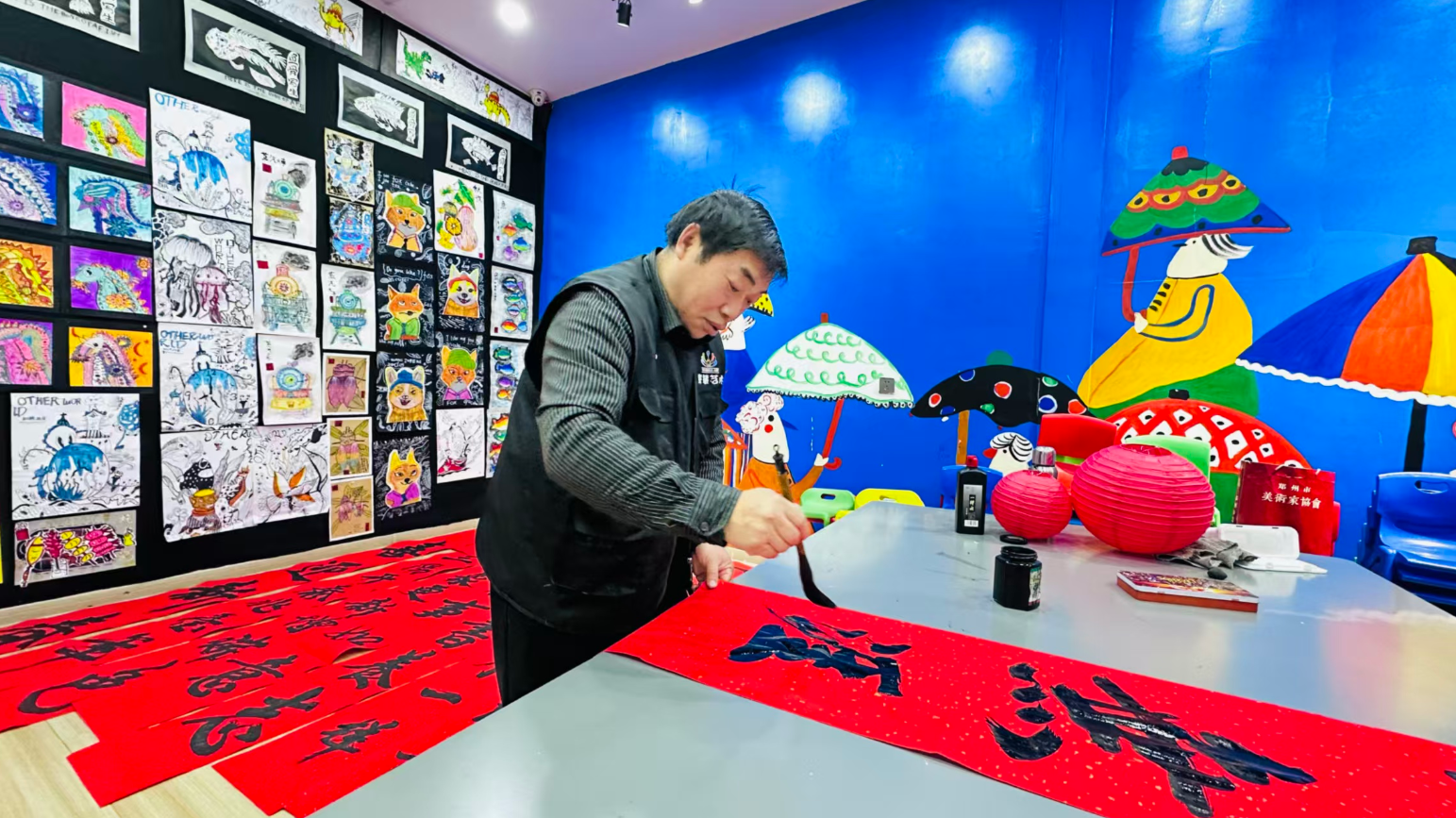 2019年,韩红伟回到登封故土,创办“翰墨缘艺术工作室”,同时在书法美术培训中心任教。课堂上,他耐心指导孩子们握笔姿势、笔画结构与色彩构图,还注重引导学生平衡文化课与兴趣学习,这份理性与包容,源于他年少时因专注书画耽误文化课的经历。此外,他承接墙体文化宣传、对联书写等业务,每逢春节仍坚持写春联与客户结缘,在笔墨相伴的日子里,书写平凡充实的人生。