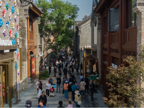 青砖灰瓦是对本土建筑基因的致敬,承载历史质感;实木檐廊延续了中原民居的温暖与亲和力;而玻璃幕墙与金属线条的介入,则如同时空的切割线与滤镜,让传统轮廓在反射与透明中与当代城市景象交融,形成“既古又新”的视觉共鸣。