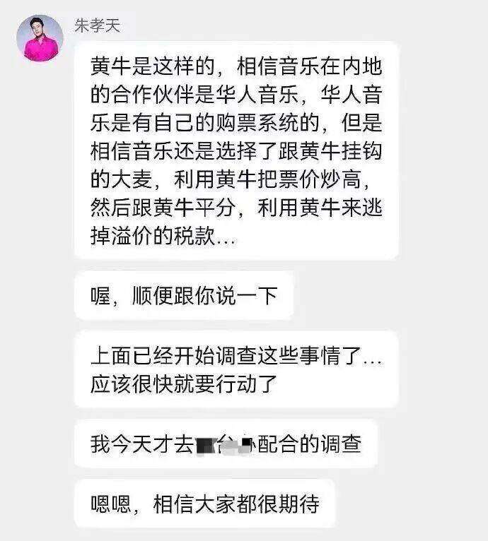 12月25日,前F4成员朱孝天在粉丝群内发声,公开举报五月天所属经纪公司相信音乐涉嫌勾结黄牛炒票逃税、跨境转移资产洗钱及强制艺人假唱等多项违规行为。相信音乐对此表示不予回应,朱孝天称已配合相关部门完成调查取证。此外,大麦官方客服告诉记者,对于朱孝天的爆料,目前大麦没有官方对外的回应公告,但大麦作为售票平台,不会有与黄牛勾结卖票的情况。