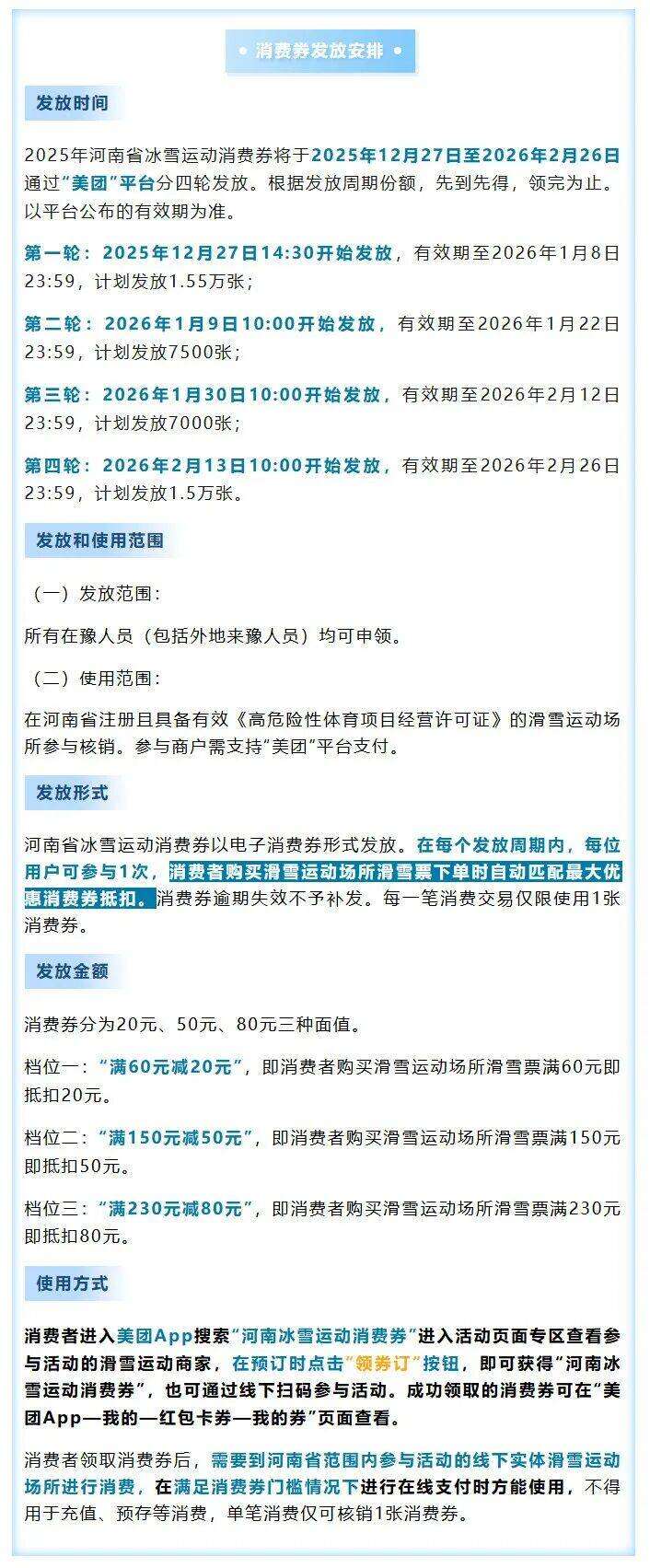 12月27日,第十二届全国大众冰雪季暨第十届河南省大众冰雪季即将正式启动,与此同时,2025年河南省冰雪运动消费券同步上线。本次河南省冰雪运动消费券无需抢券,在“美团”平台查看参与活动的滑雪运动商家,在预订时点击“领券订”按钮即可获得“河南冰雪运动消费券”,下单时直接抵扣,先到先得,先下单先抵扣,用完为止。