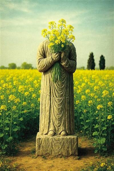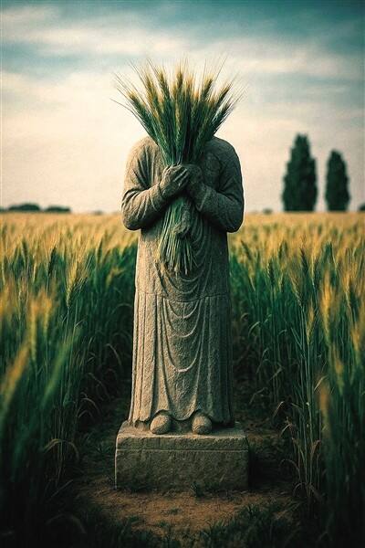 方金 《今人不见古人耕 石俑窥视千年收》(AI作品)