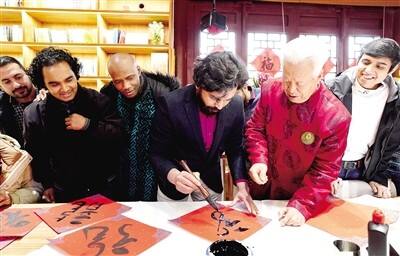 在郑外国留学生在城隍庙学习用毛笔写汉字。