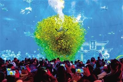 十万尾金鲹化作金色潮涌,潜水员与鱼群的互动成为深海舞台的主角。