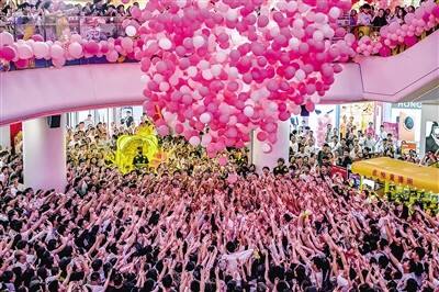 七月初七中国的情人节,数千只粉色气球空降郑州亚细亚卓悦城,浪漫情人尽享七夕祝福。