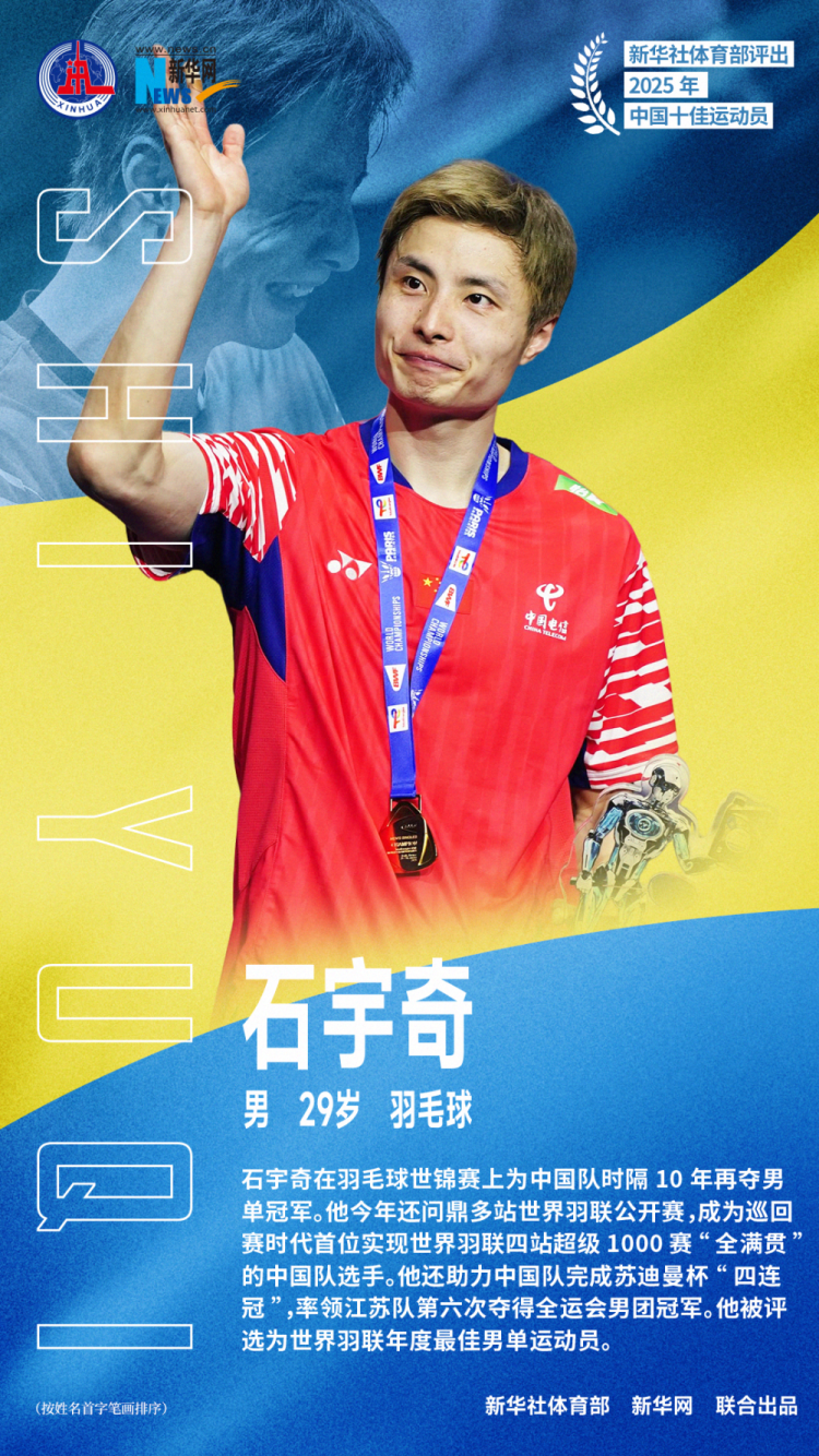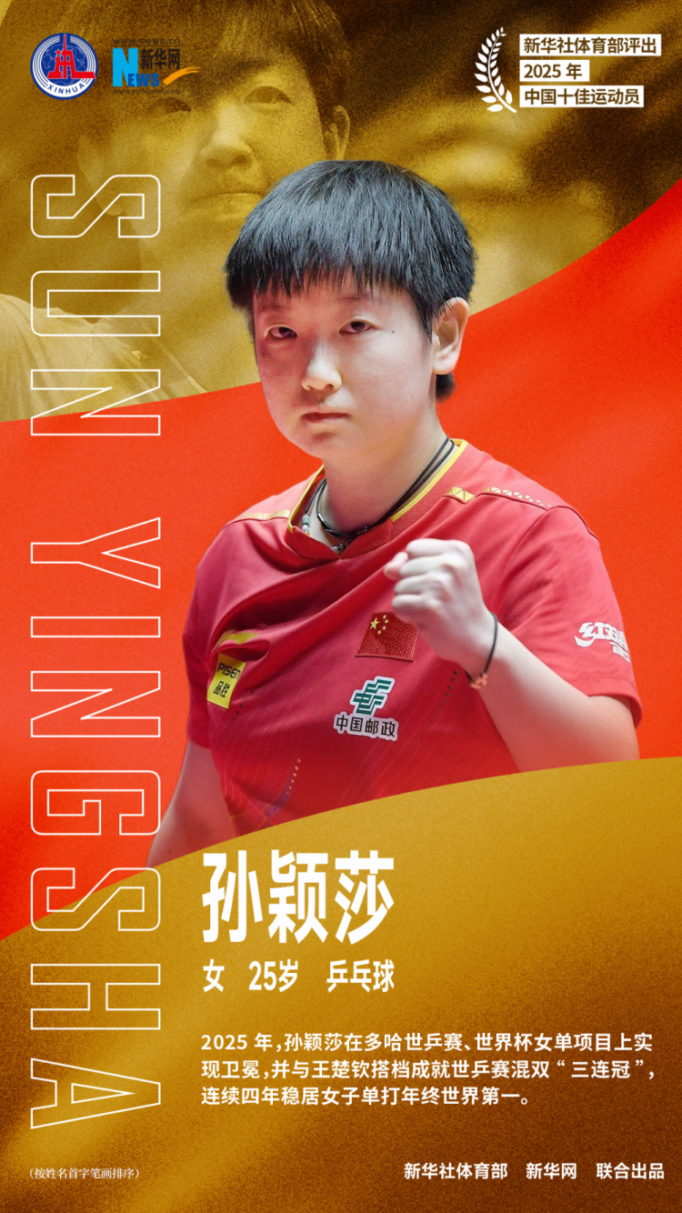 新华社体育部评出2025年中国十佳运动员如下(按姓名首字笔画排序):