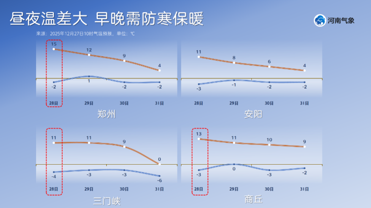 据河南气象,本周末全省晴朗,多地最高气温升至15℃左右,午后暖意显著,但早晚最低气温在0℃及以下,昼夜温差普遍超10℃、局部达15℃。此外,明天早晨中东部、西南部局部有雾。后续两股冷空气接连影响,28日夜里至30日以降温为主,31日起有4级左右偏北风(阵风6~7级),30日夜里至2026年1月1日全省自西向东迎雨雪,31日为主要雨雪时段,累计降温6℃~8℃,1月3日凌晨最低气温约-6℃,需关注假期出行安全。