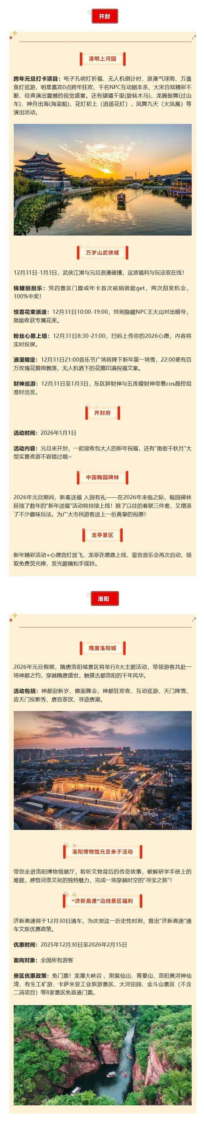 岁末的钟声越来越近,2025年的最后几天,各大景区早已备好满屏惊喜,诚邀各地朋友来河南,在这些宝藏景点里承包跨年夜到元旦的所有仪式感↓