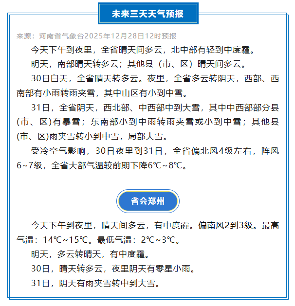 12月28日,据郑州市气象台消息,受西南暖湿气流和强冷空气共同影响,30日夜里至31日,郑州市有一次雨雪强降温天气过程,主要降雪时段在31日白天到夜里,降水量5~8毫米,局部10~15毫米。郑州暴雪下哪儿?最新消息来了