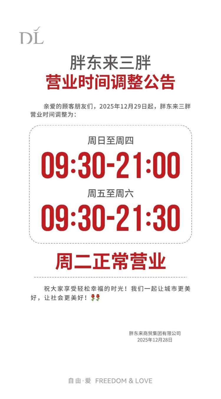 12月28日,“新乡胖东来大胖”发布公告,宣布胖东来三胖店营业时间将做调整。公告显示,商场整体营业时间调整为周日至周四9:30~21:00,周五至周六为9:30~21:30,周二正常营业。