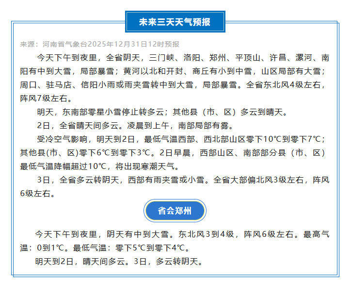 据河南气象,受冷空气影响,河南降雪正在进行中,全省大部气温显著下降,最高气温较昨日降幅7℃~10℃。预计今日夜里,中西部、西南部等多地有中到大雪,局部暴雪,黄河以北等地有小到中雪,东南部小雨或雨夹雪转中到大雪,全省伴有东北风4级左右、阵风7级左右。明天全省大部放晴,1日至2日最低气温西部、西北部山区达-10℃至-7℃,其余大部-6℃至-3℃,2日早晨部分地区将现寒潮,南部局部有雾。